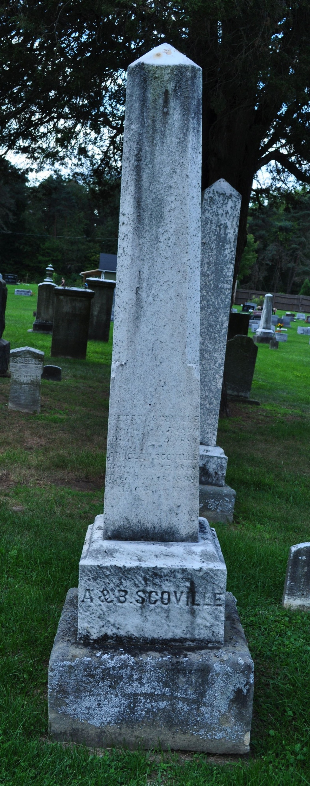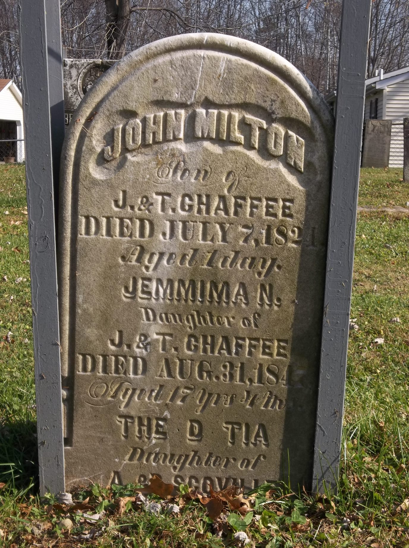 John and Jemmima Chaffee with their niece Theodotia Scoville in South Mecca Cemetery. Photo by Sherry Champlin for Find A Grave. Note how the o's are missing in Theodotia's name.