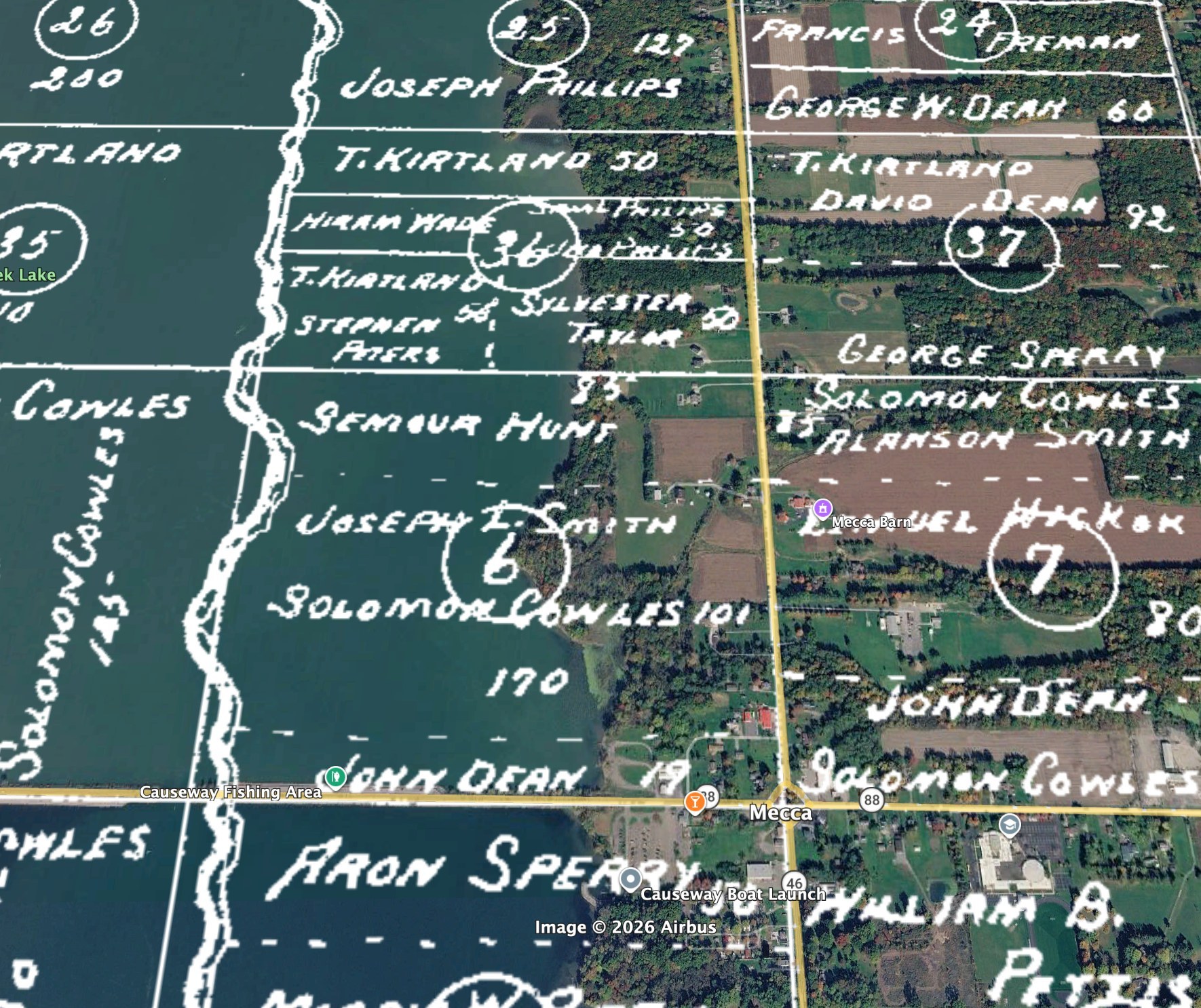 By 1819, Mecca had fourteen families living within its boundaries, all on the east side of Mosquito Creek. Those families included the aforementioned Joseph Dawson, John Rose, and Peter Rowe families, as well as those of Lemuel Hickok, Samuel Phillips, Sylvester Taylor, Martin Daniels, Daniel Tucker, Joseph Phillips, David Ballard, Joseph Headly, Joseph Barstow, a Mr. Sturgis, and Seymour Hunt.