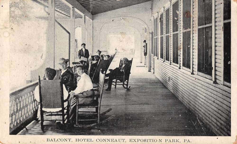 Postcard showing guests on the porch of Hotel Conneaut, about 1908