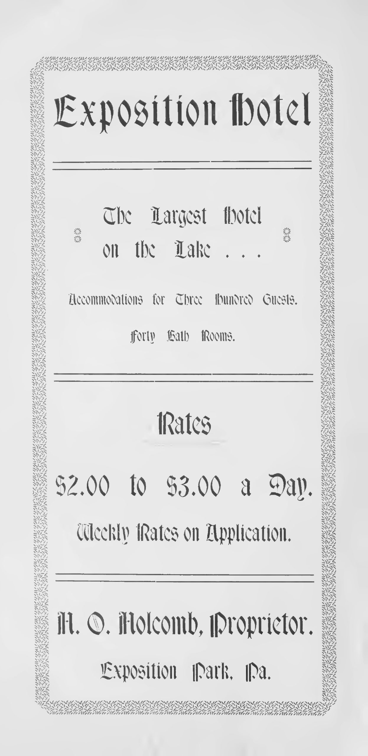 Mr. O. E. Gleason, owner of the Mansion House in Titusville and partner to Frank Lockwood, leased the Exposition Hotel to E.D. Comstock for the season. Fred G. Pardee of Titusville operated the hotel through the year of 1900 before departing to lease a hotel in Watertown, N.Y.