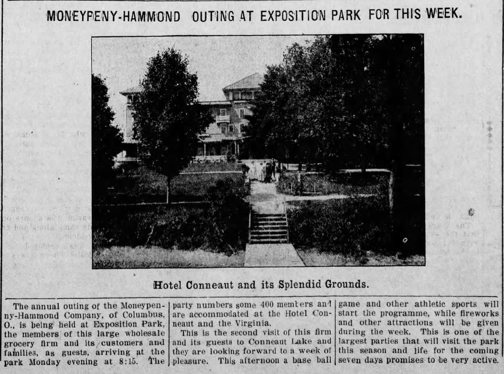 Many churches, groups and societies held their annual outing at the park. In mid-June, 2,000 delegates from the Grand Lodge of the Eastern Star of Pennsylvania spent the week at the resort. They used Hotel Conneaut for their festivities and booked every room in the hotel.