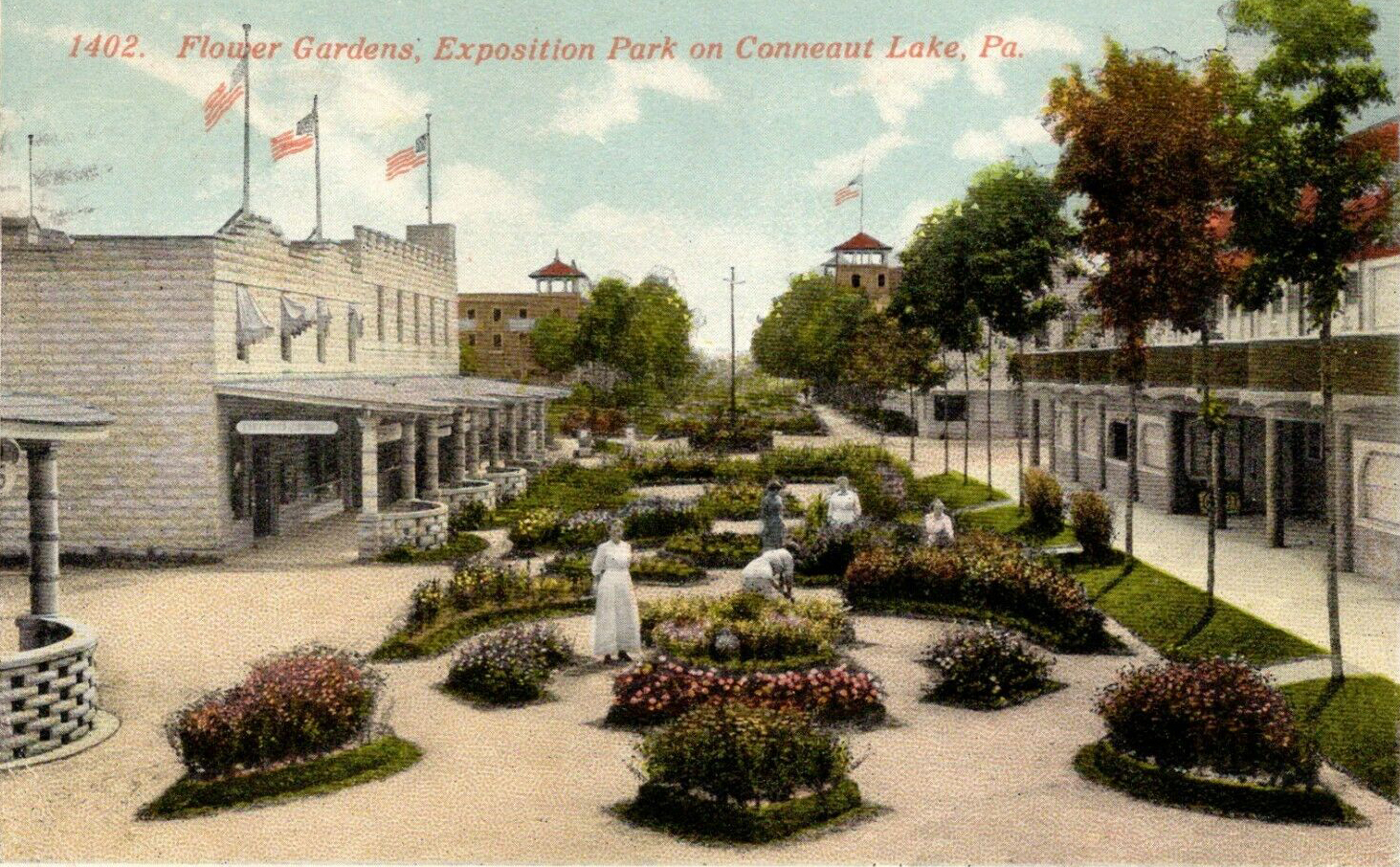 1914 Postcard showing gardens leading to Hotel Conneaut in back left and Hotel Virginia in back right