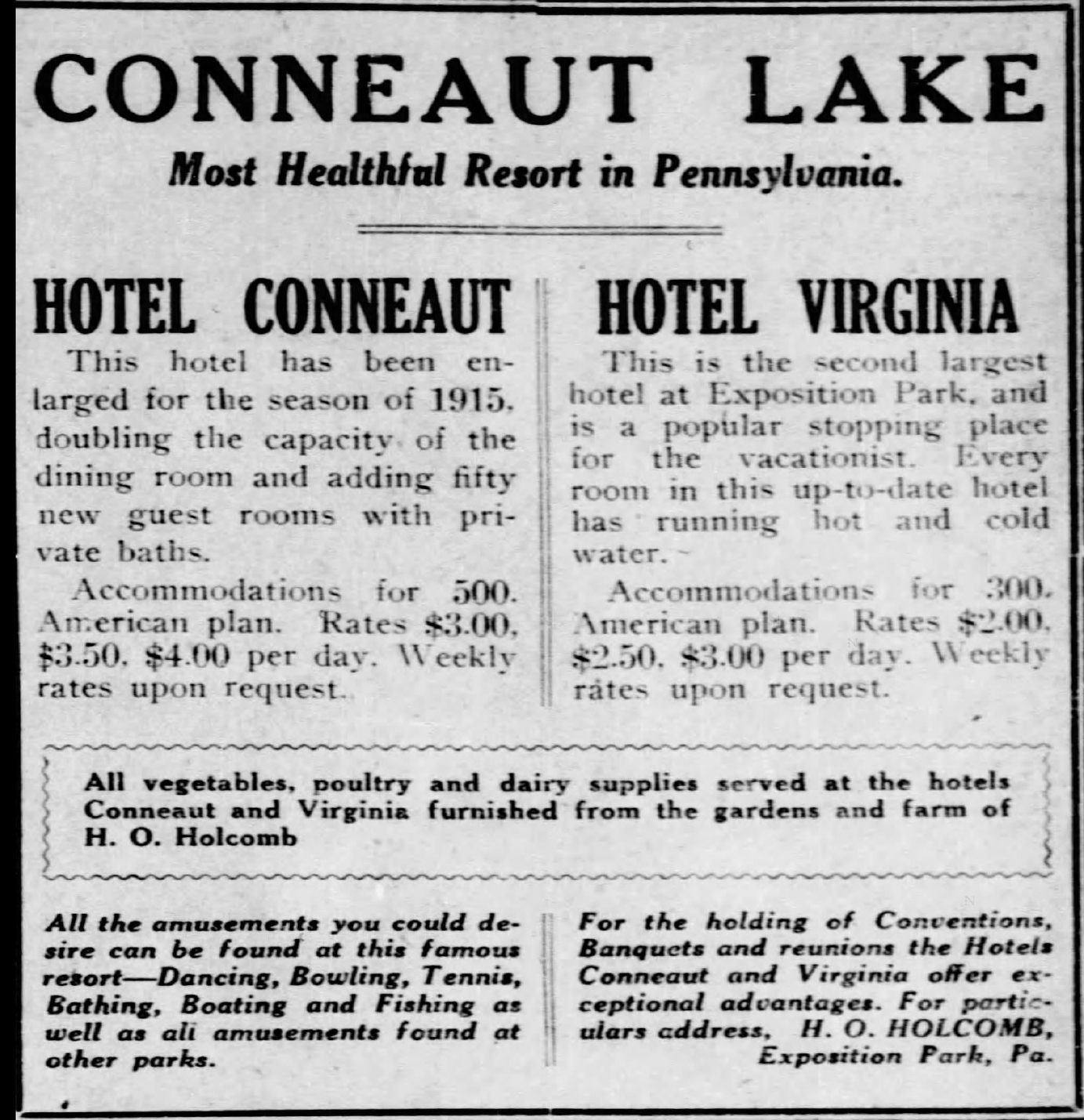 With farming the topic of conversation, the association praised the efforts of Henry Holcomb who proved quite a busy man. Besides being president of the association and the park as well as proprietor of hotels Conneaut and Virginia, he owned a seventy-five acre farm nearby. Not only did his farm supply all the produce, eggs, milk, and butter served in hotel Conneaut’s dining room, but it boasted 170 pigs, a length of chicken coops, and incubator house. He had many gardeners employed to maintain the gardens and they lived in cottages on the farm.