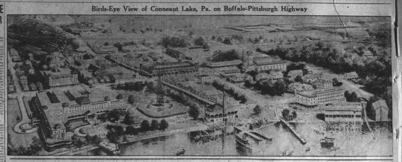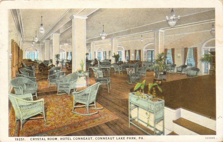 In Part Four of my ongoing series of Hotel Conneaut and Conneaut Lake Park (the former Exposition Park), I dive into the decade of the roaring 20’s. The 20’s brought not only the Charleston, but an enormous surge of people purchasing private family automobiles. Due to assembly lines and mass production, the average family could afford to purchase a vehicle and people began to practically live in their cars. As an unsavory result, all summer resorts began to suffer as the amount of guests diminished enormously. People no longer wished to stay in one place, spending a week or two at Conneaut Lake Park. Now, they were eager to drive from state to state or across the country and see all the sites. It truly was the end of an era, but the glitz and glamor of Hotel Conneaut had yet to wear out and plenty of visitors continued to book their annual stays and company dinners at the hotel.