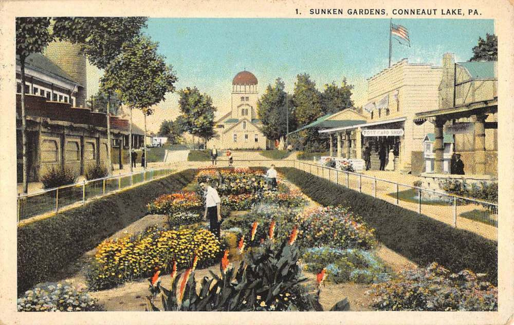 1920 Postcard featuring the sunken gardens of Conneaut Lake Park