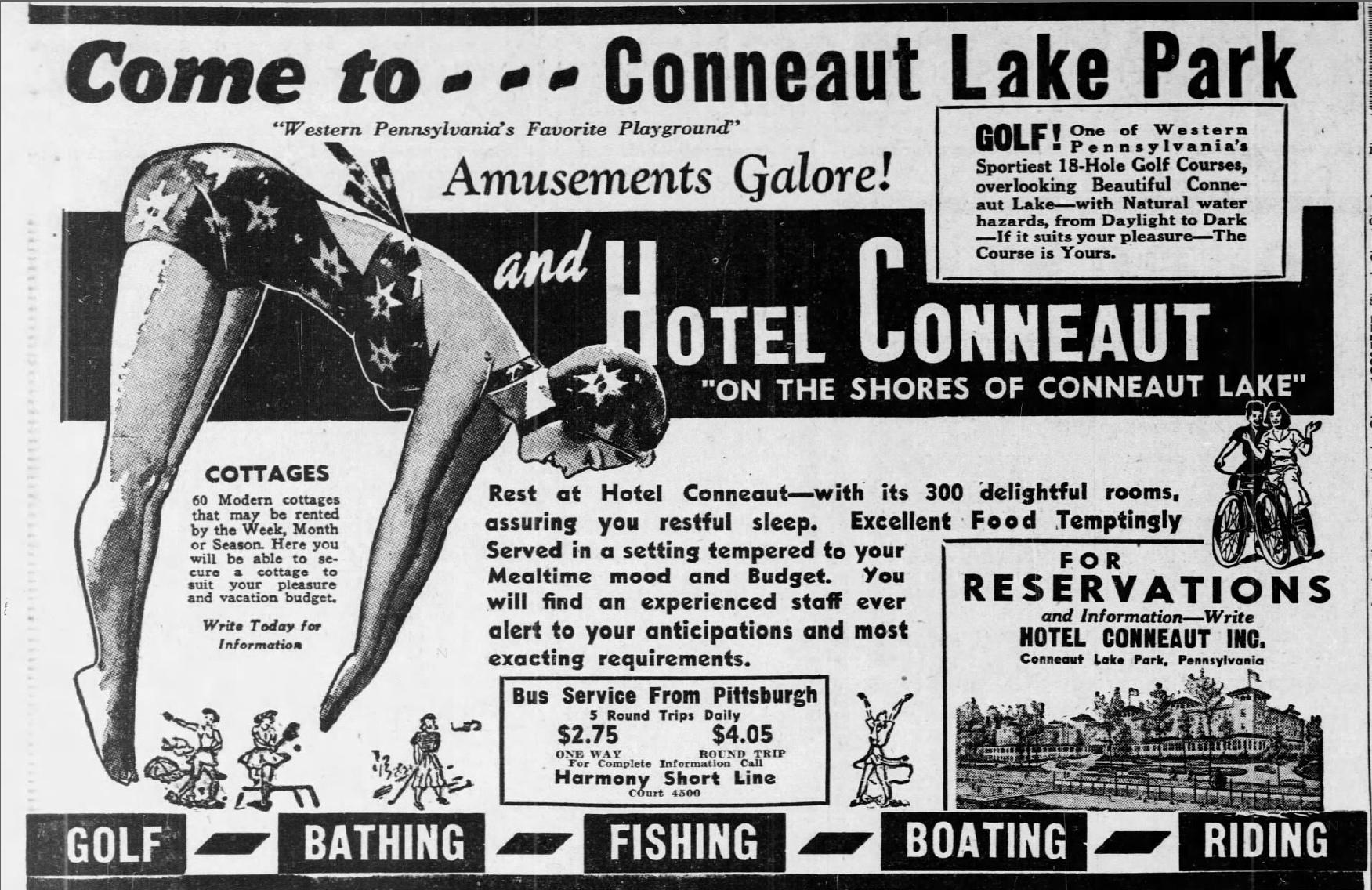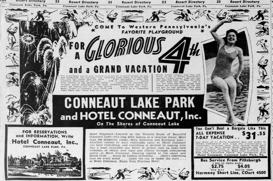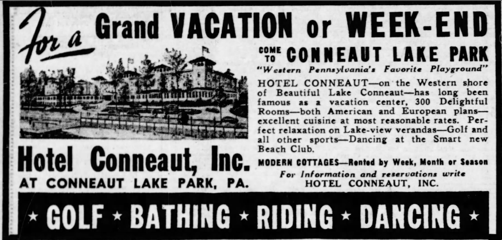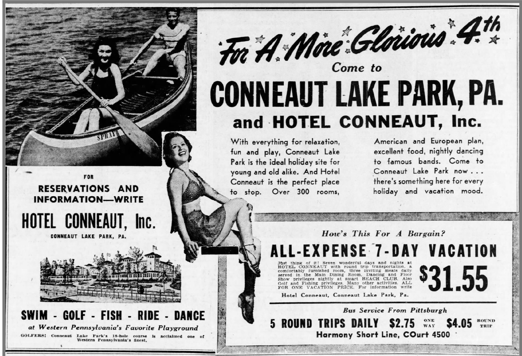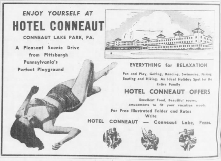 Just think of it! Seven wonderful days and nights at HOTEL CONNEAUT with round trip transportation, a comfortable, furnished room, three inviting meals daily served in the Main Dining Room. Dancing and Floor Show privileges nightly at smart BEACH CLUB. Also Golf and Fishing Privileges. Many Other Activities, ALL FOR ONE VACATION PRICE. For information write Hotel Conneaut, Conneaut Lake Park, Pa.” –The Pittsburgh Press Sunday, June 23, 1940
