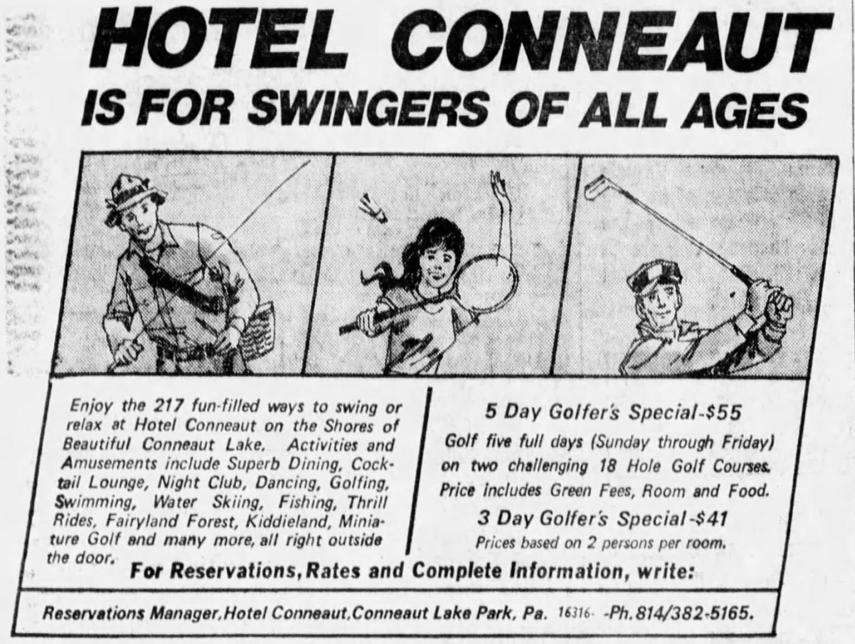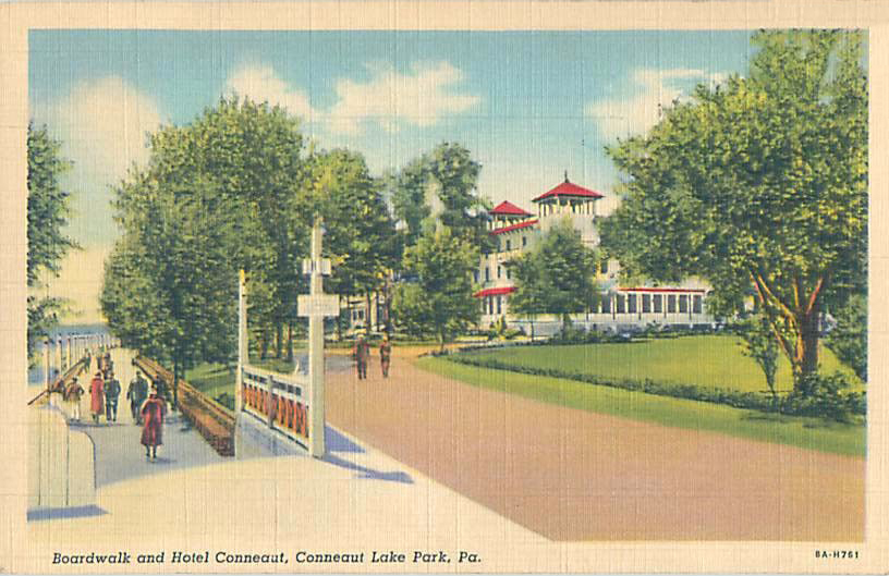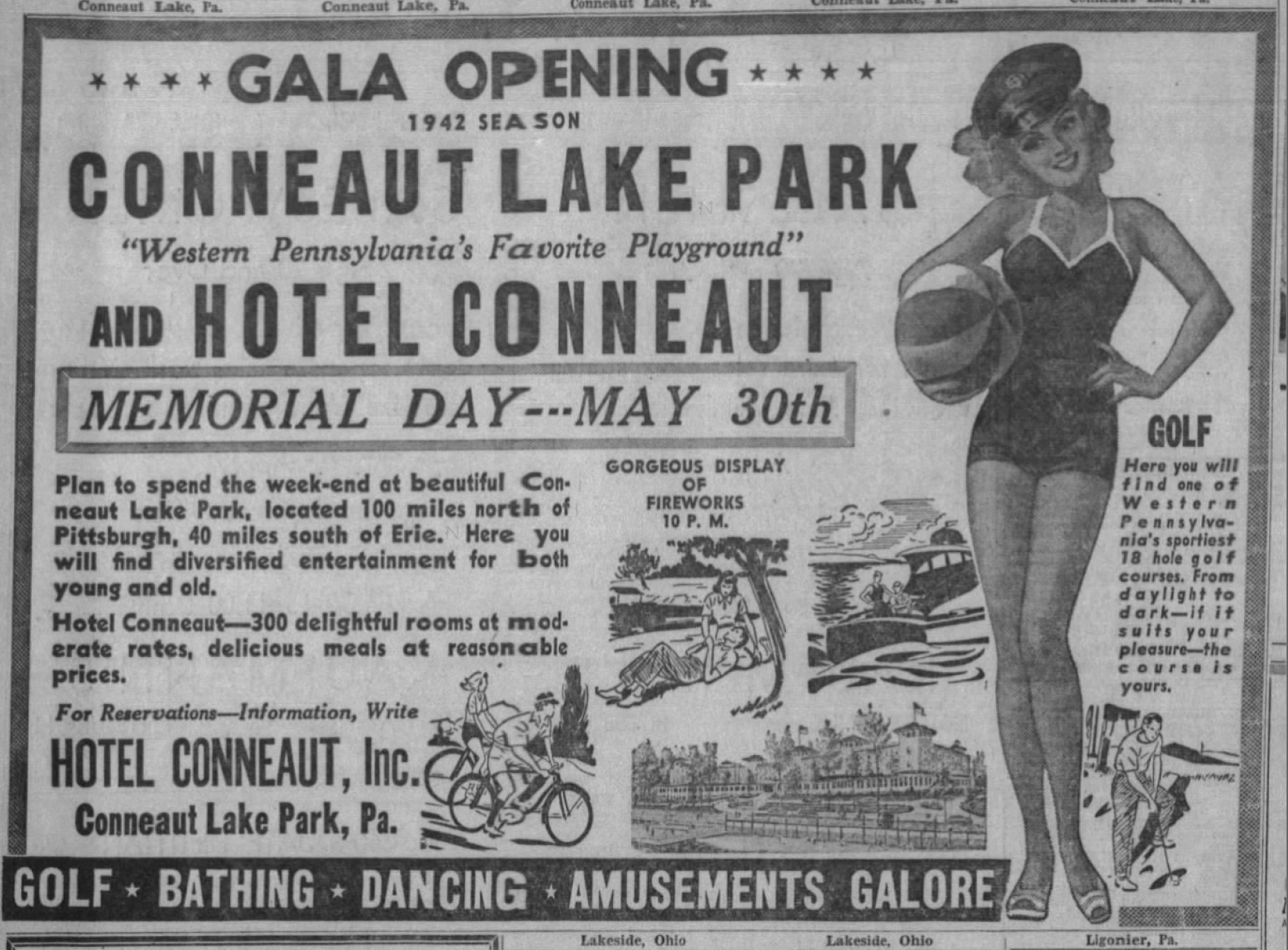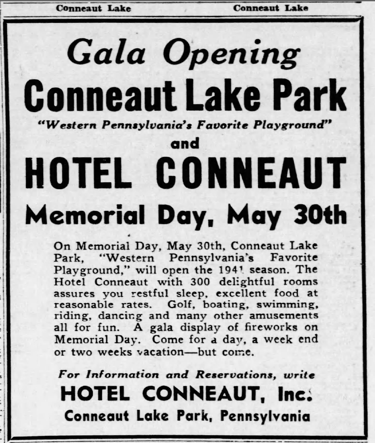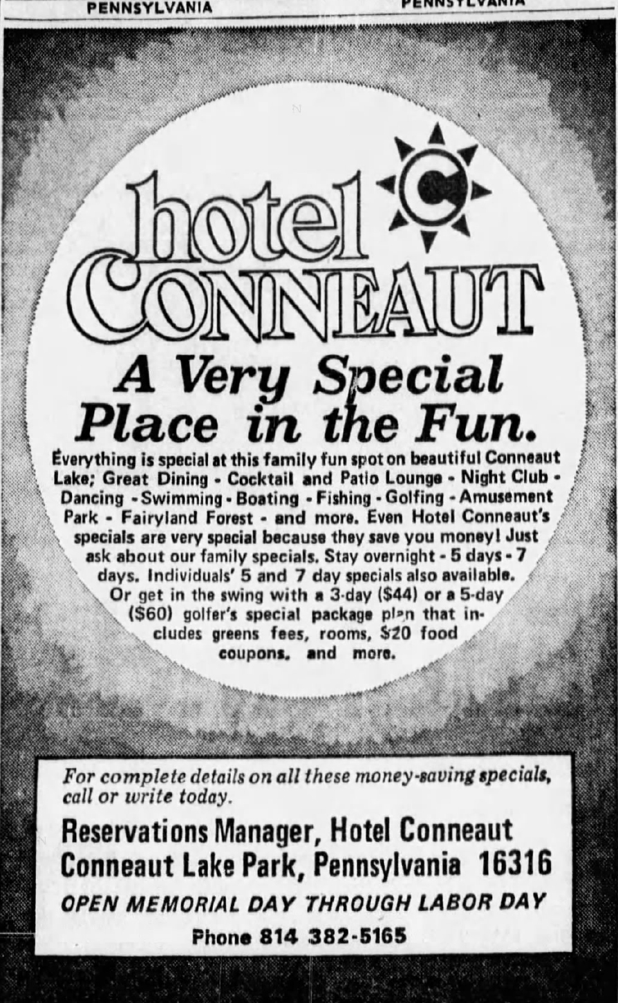 Just think of it! Seven wonderful days and nights at HOTEL CONNEAUT with round trip transportation, a comfortable, furnished room, three inviting meals daily served in the Main Dining Room. Dancing and Floor Show privileges nightly at smart BEACH CLUB. Also Golf and Fishing Privileges. Many Other Activities, ALL FOR ONE VACATION PRICE. For information write Hotel Conneaut, Conneaut Lake Park, Pa.” –The Pittsburgh Press Sunday, June 23, 1940