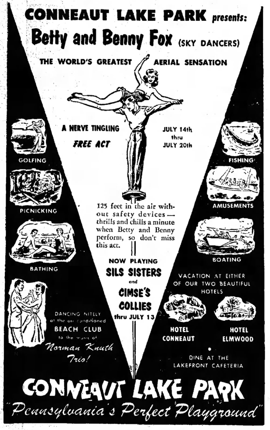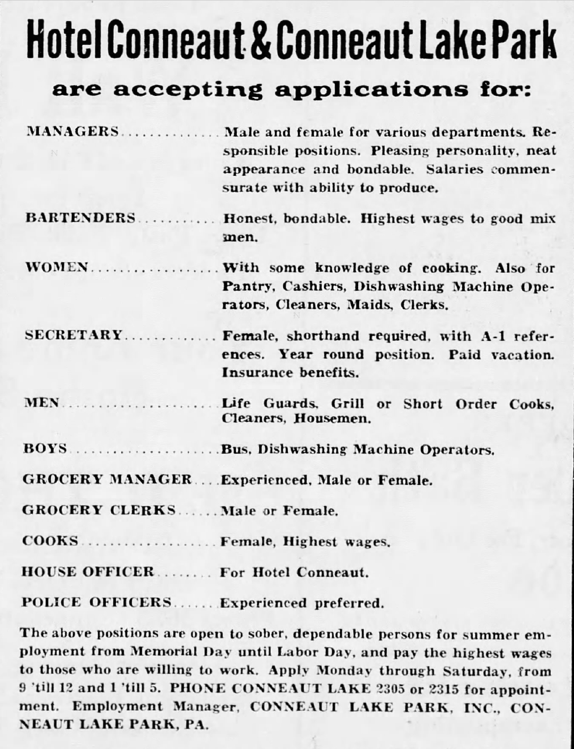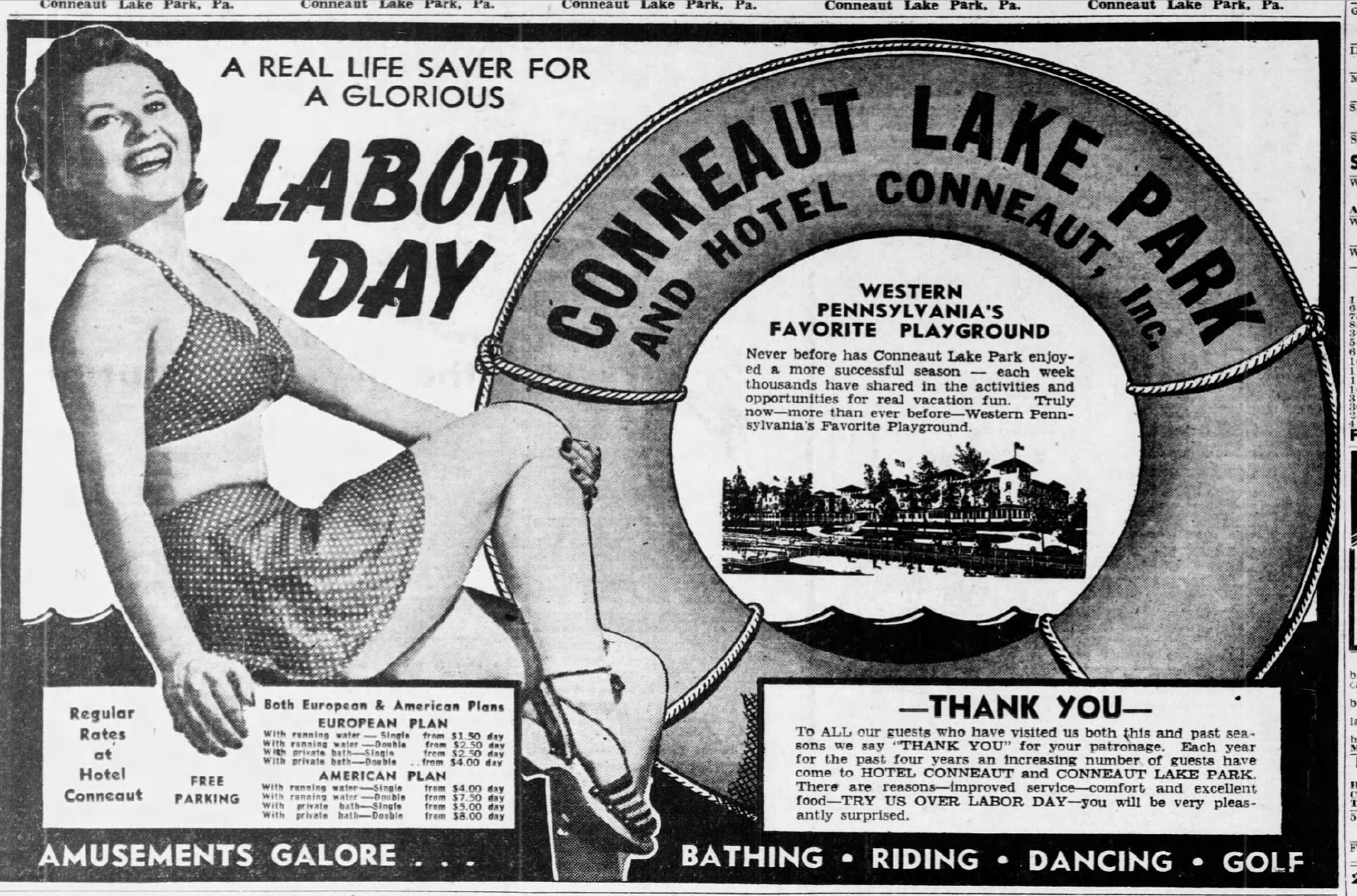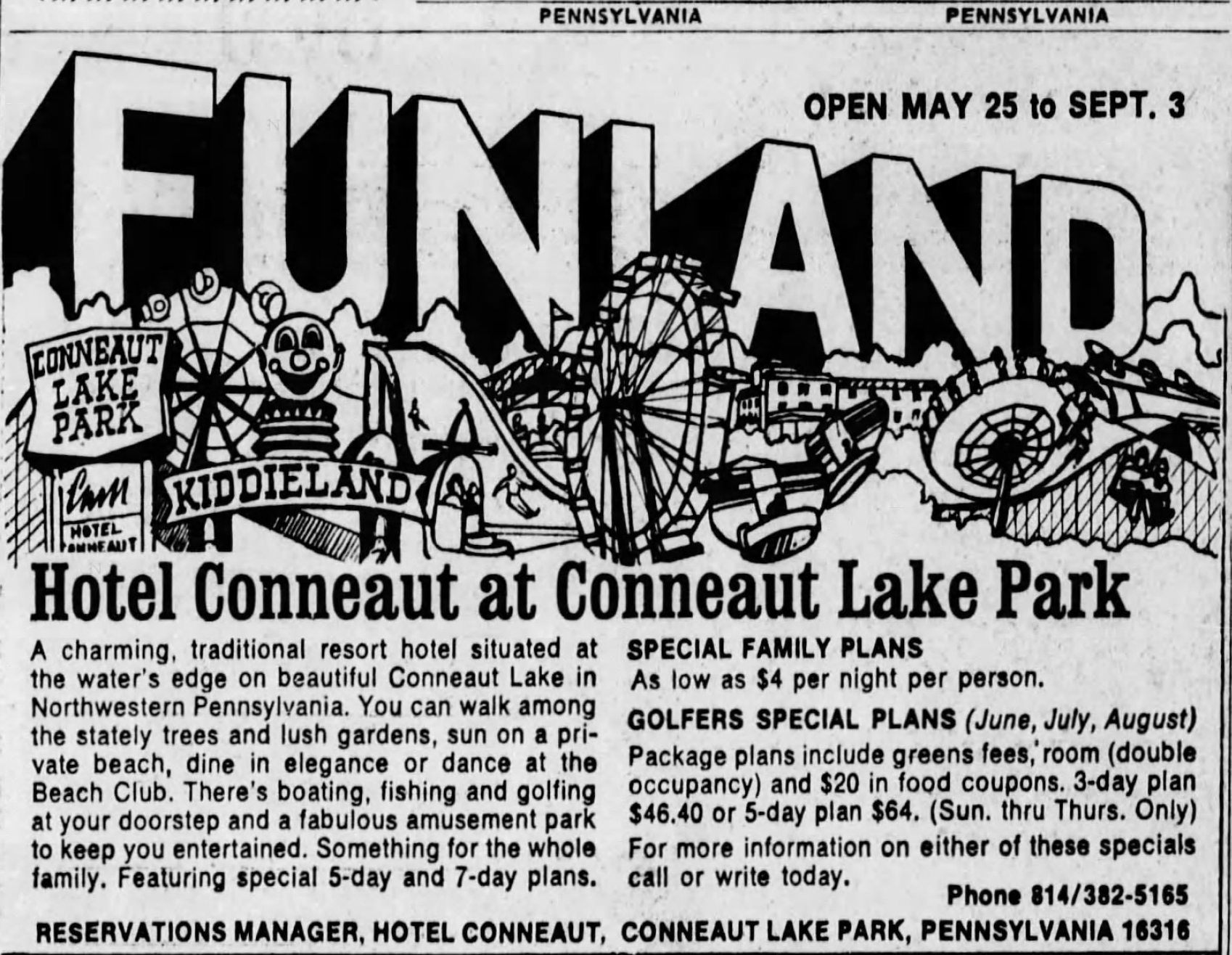 Just think of it! Seven wonderful days and nights at HOTEL CONNEAUT with round trip transportation, a comfortable, furnished room, three inviting meals daily served in the Main Dining Room. Dancing and Floor Show privileges nightly at smart BEACH CLUB. Also Golf and Fishing Privileges. Many Other Activities, ALL FOR ONE VACATION PRICE. For information write Hotel Conneaut, Conneaut Lake Park, Pa.” –The Pittsburgh Press Sunday, June 23, 1940