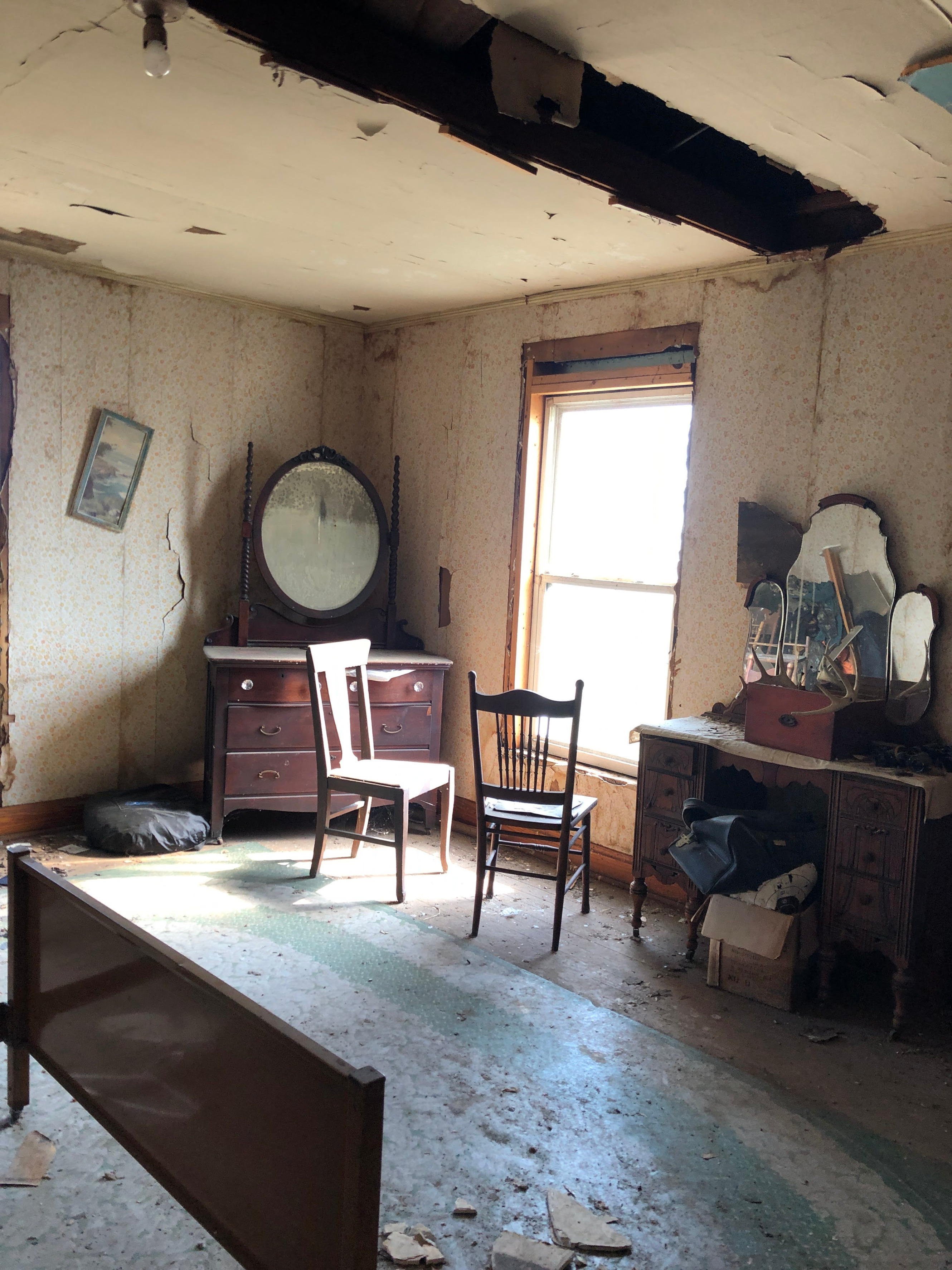 The ceiling of the second floor was caving in and we could see up into the attic. The upstairs and stairwell had that burdensome, "heavy" feeling I attribute to haunted places. With all the history of the place, I'd be surprised if no residual energy existed in the place.
