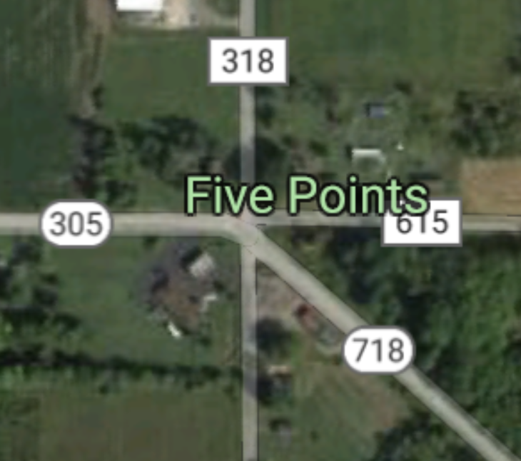 Google Maps aerial view of the five points intersection