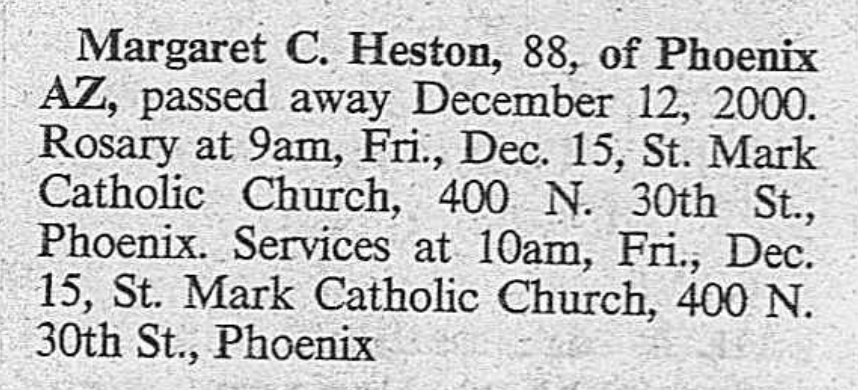 Margaret lived to the age of 88. Her Rosary and funeral were held on Friday, Dec. 15, 2000, at St. Mark Catholic Church in Phoenix. She is buried in Tempe Double Butte Cemetery.