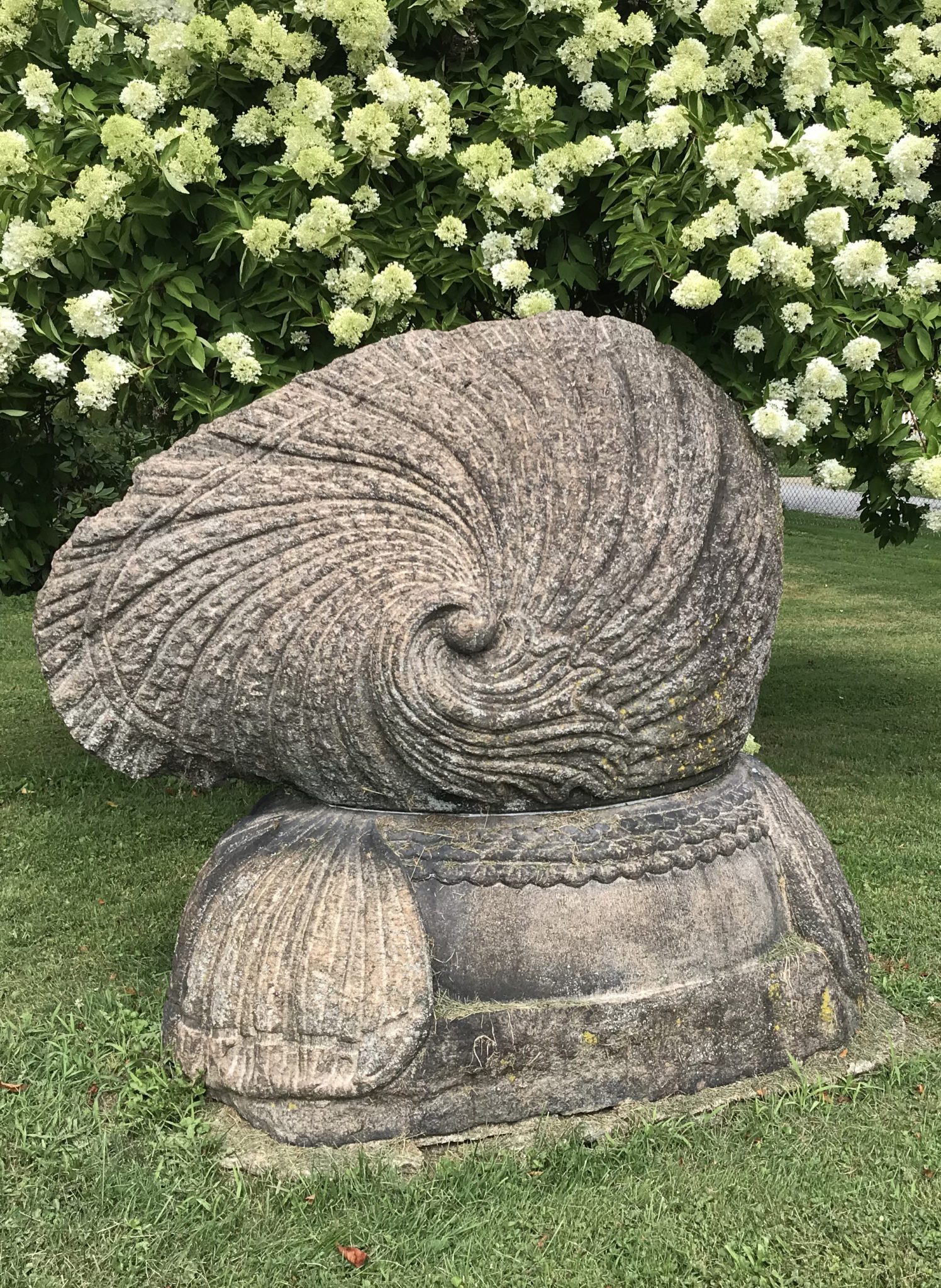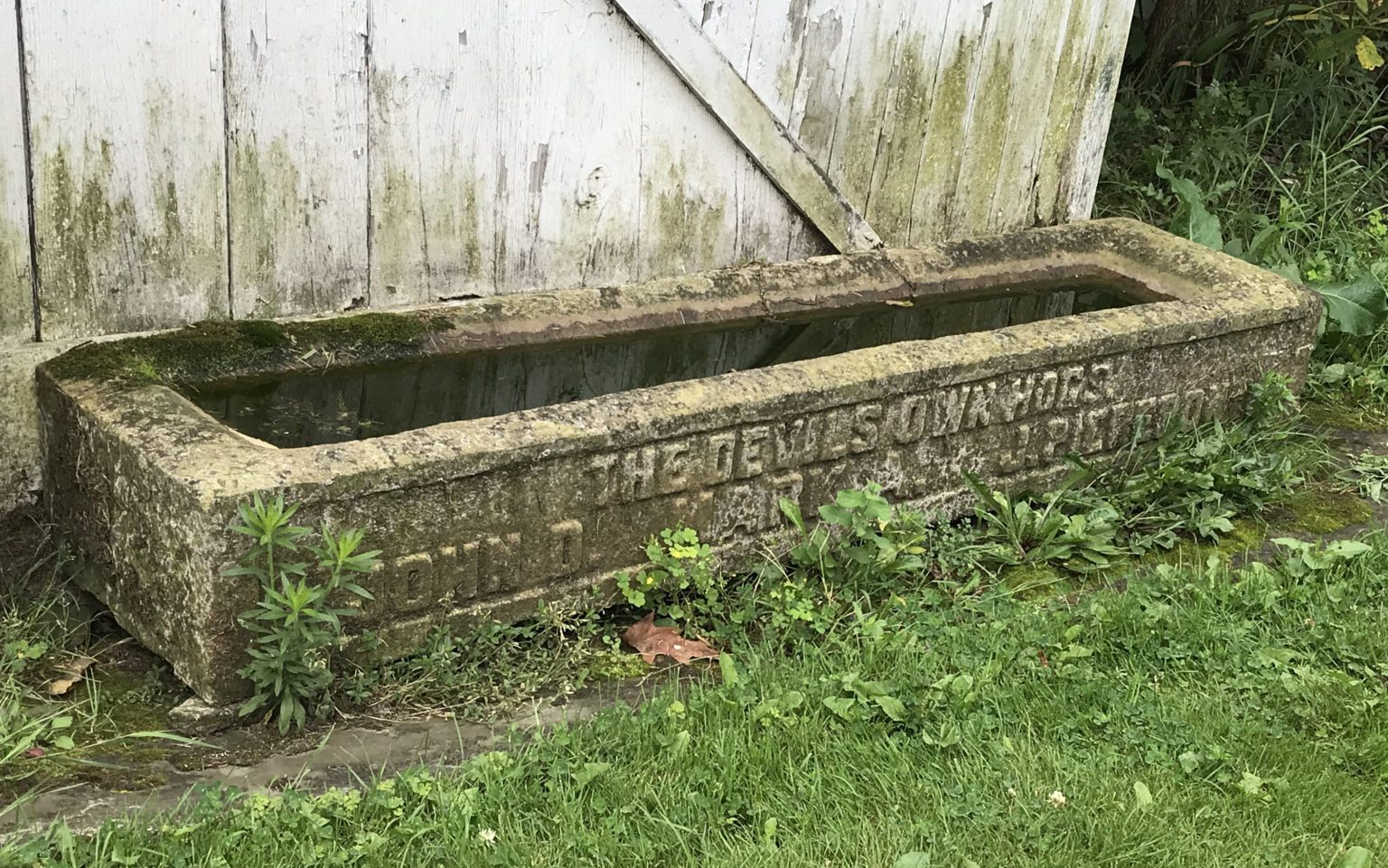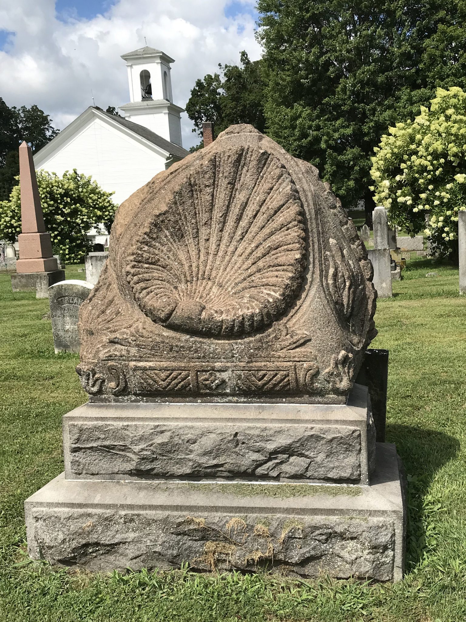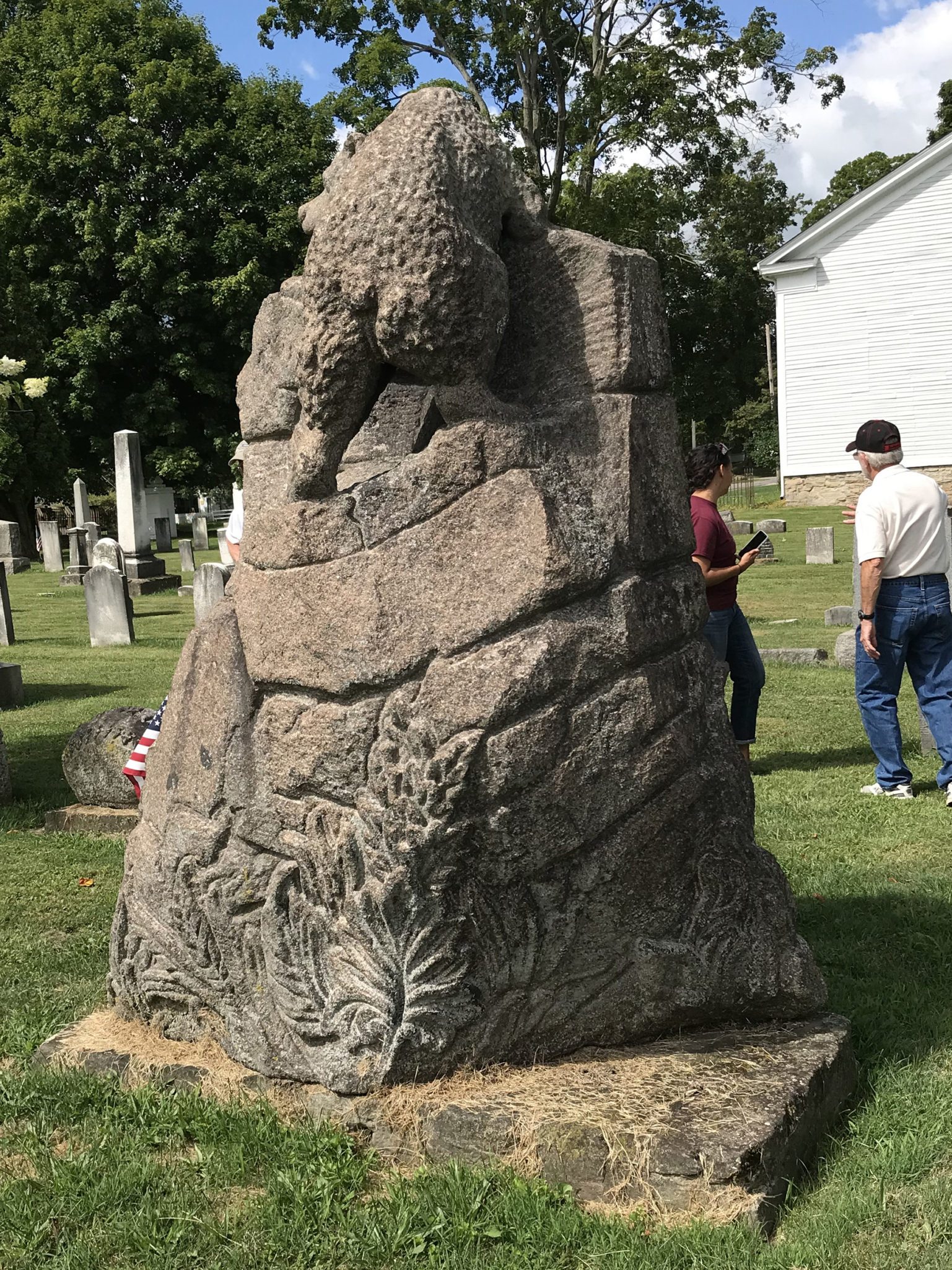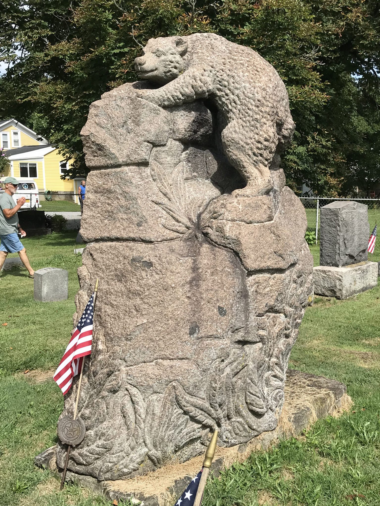 One of his first carvings was the eagle atop the Soldier’s Monument that stands on the Mespo Commons green. He also carved many of the ornate stones in Fairview Cemetery, including his own, a towering monument depicting a bear climbing a rock precipice. Shell–shaped stones mark the graves of family and friends, a trademark theme of Brigden’s. He even carved a trough that once sat on the village green but now rests against the outside wall of the meeting house. The front of the trough reads, “The Devils Own Hogs: John. D., Mark A., J. Pierpont” which expressed his disdain for tycoons with fortunes amassed by predatory means. The two names on the ends are John D. Rockefeller and John Pierpont Morgan Sr. (J.P. Morgan), but for the life of me, I have no idea who Mark A. could be. If anyone help me out with this one, I would be most grateful.