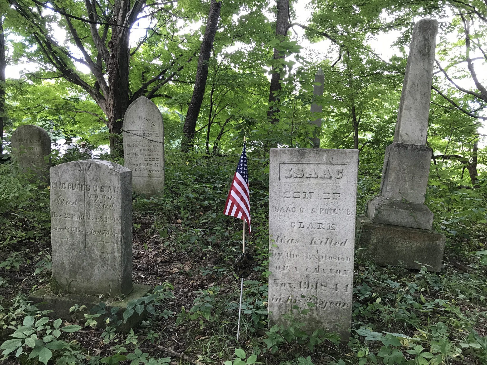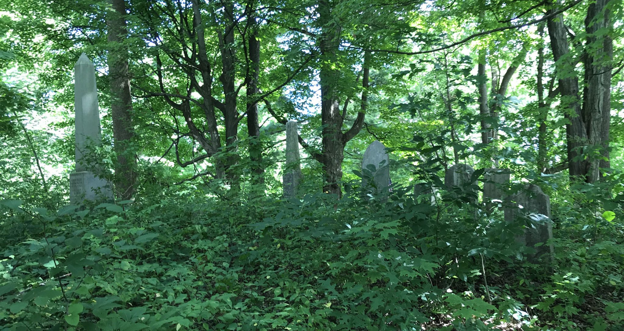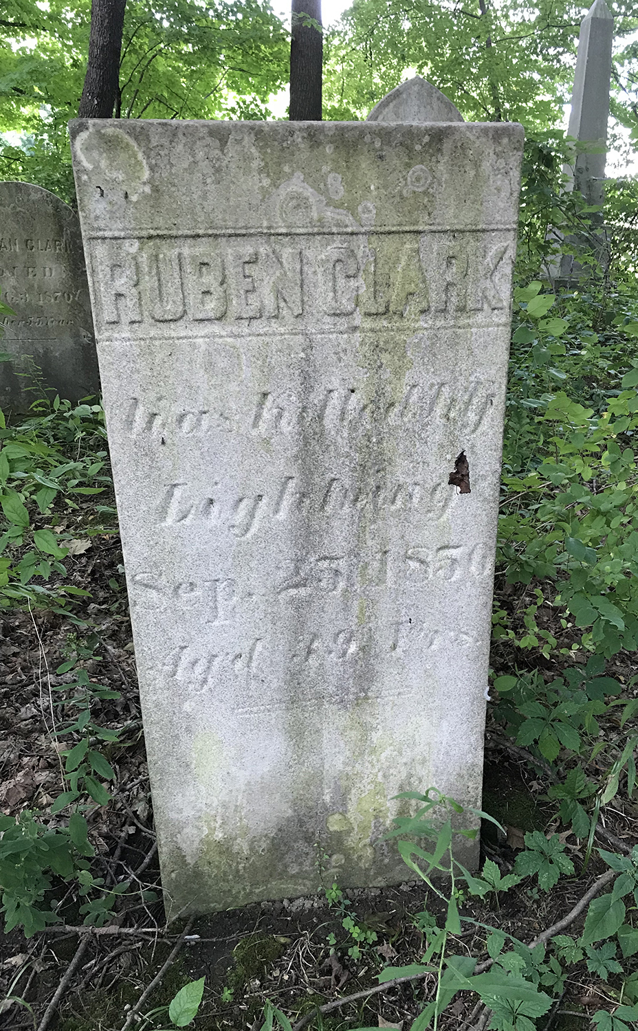 After circling the commons and noting the nostalgia brought on by the rows of historic homes, including the Lyman House, we pass the general store and turn the corner to walk around route 87. We turn into the driveway of a private home where Darcy notifies the owner of our arrival. The man is not feeling up to coming out to chat, but allows us to stroll through his backyard and up a hill into a wooded area. There, covered in underbrush is an old burial ground. Clark Cemetery had once been a family cemetery and only a handful of stones remain, some inscribed with the manner of death. Isaac Clark, aged 22 years, died from an explosion of a cannon in 1844. Ruben Clark, aged 39 years, was struck by lightening in 1850. Bearing an unusual name, little Almond Clark died at the age of 2. The first known burial is Ephraim Clark who died in 1830, so Fairview Cemetery predates Clark Cemetery. Find A Grave lists twenty-four graves in all, though I suspect there are more.