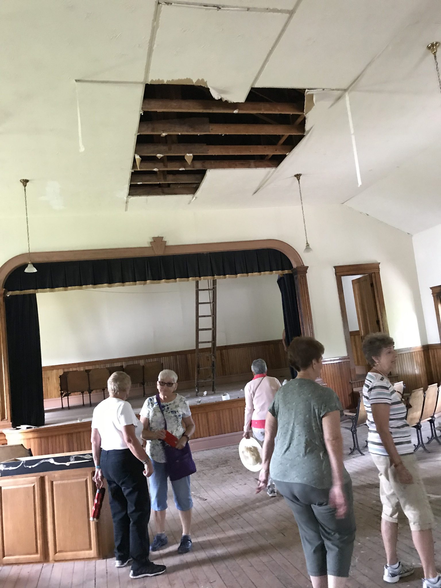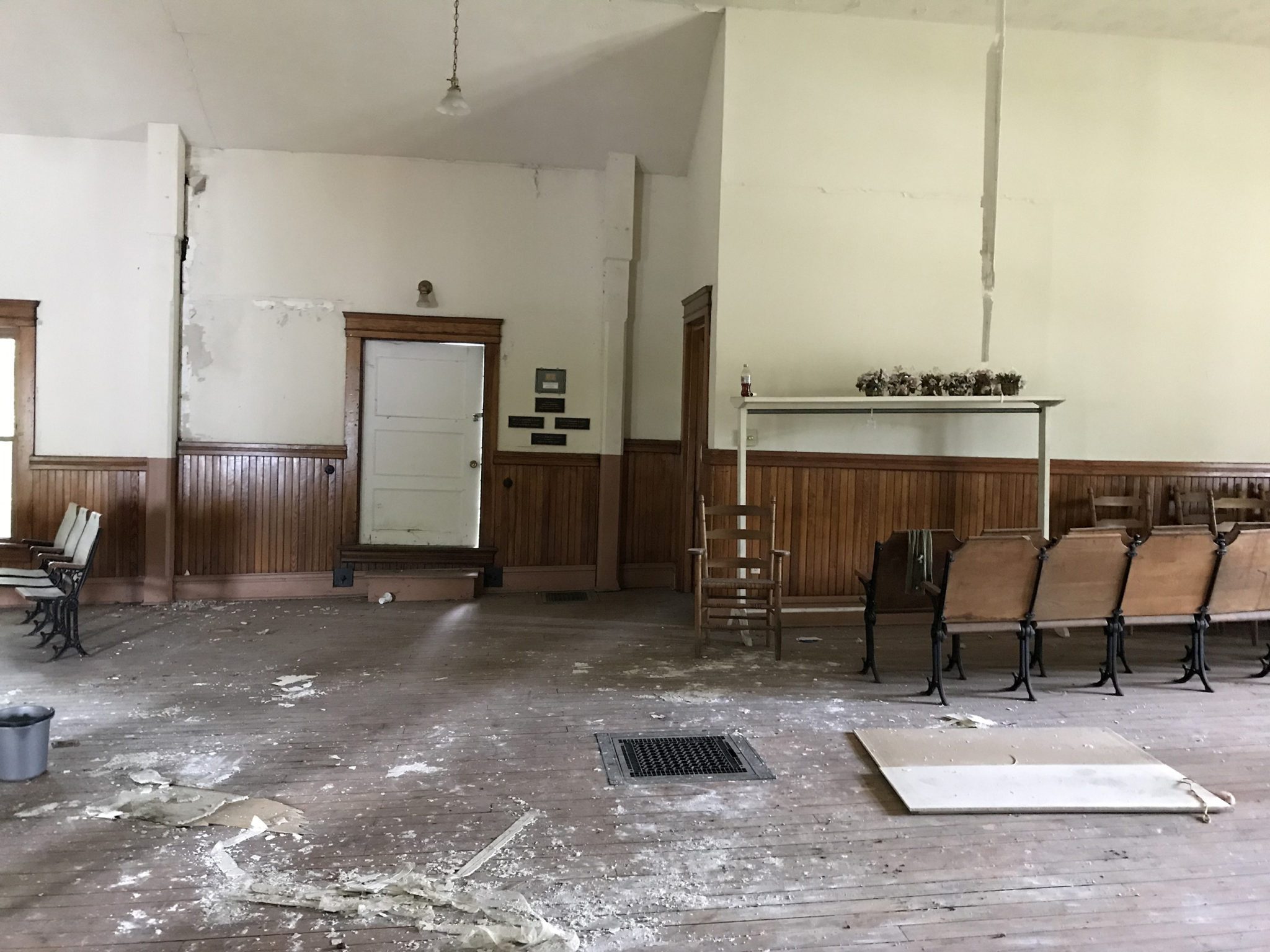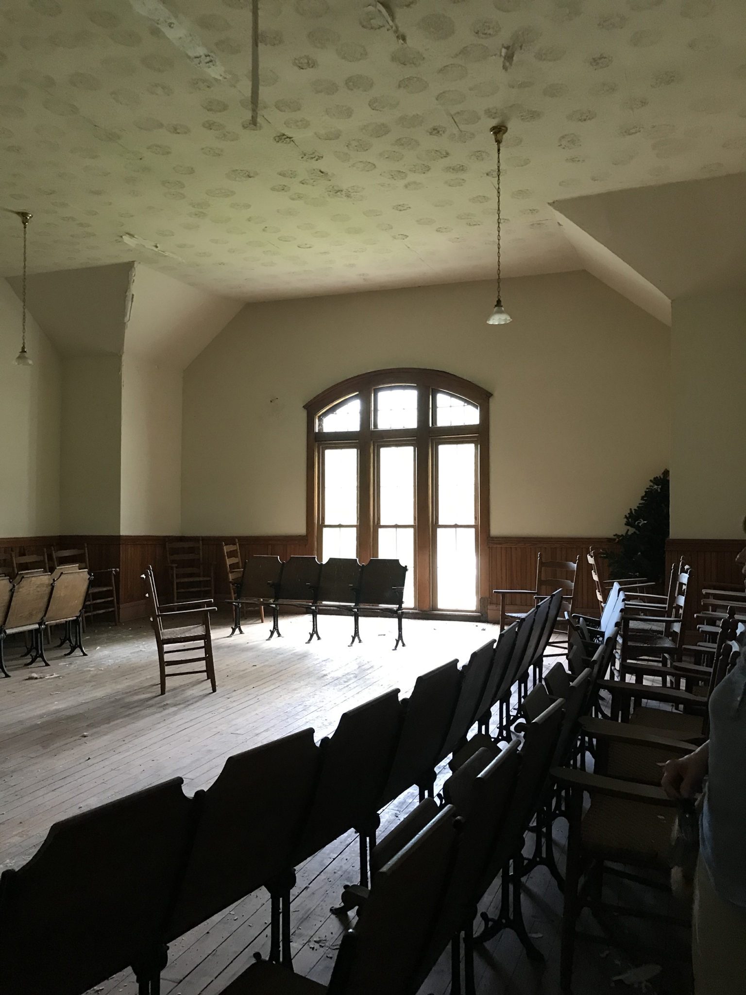 As soon as we tour the house, Darcy directs us to our cars and we drive north to the old Town Hall that sits on the southeast corner of Routes 87 and 534. We park in the gravel parking lot behind the tall, red-bricked building. Stepping over the threshold into the two-story structure, we are taken to a period where neighbors come together for fellowship and entertainment. We take the stairway to the left of the interior entryway that leads upstairs into a large auditorium. A stage occupies the north end of the room while the floor slopes upward toward the south end of the room, an intentional construction detail to allow people sitting in the back to see over the heads of those in front. The seats have been pulled off to the sides of the auditorium as pieces of the ceiling fall away to scatter the floor with debris. The grand stage, once the center of excitement, is empty and coated in dust. I begin to imagine the political debates and Christmas programs that once took the stage, among all manner of community events and festivities.