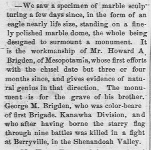 Born on November 29, 1841, Howard Bridgen was a local carver, political cartoonist, and satirist. He was the son of Charles Brigden and Mary Ann Sperry and enlisted in the Union Army where he served as a spy. He suffered a broken arm and upon discharge, he returned to Mespo where he made his living as an artist. Though he had guidance from his mentor, Walter Supple, Brigden had natural talent that many considered even genius.