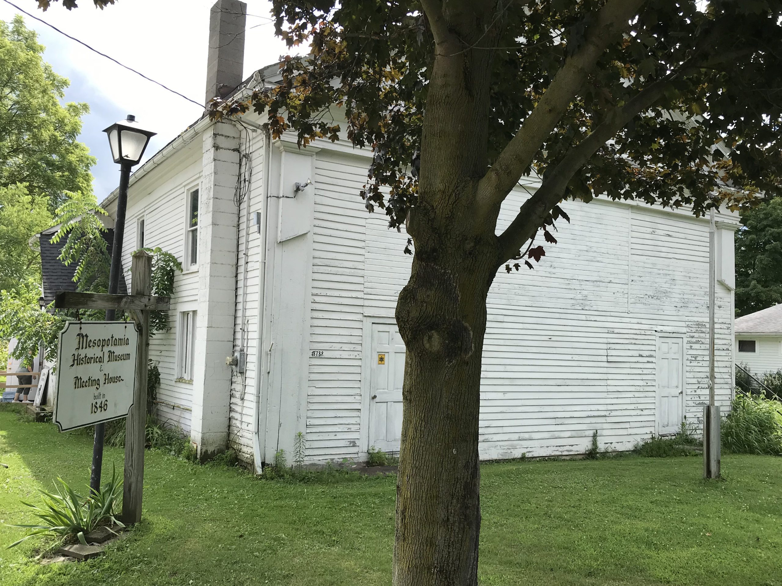 We begin our walk around the commons of Mesopotamia village, starting with a stop at the Mesopotamia Historical Museum & Meeting House. Built in 1846, it was originally a Spiritualist Church. Nowadays, the Historical Society conducts their meetings in this building. Today during our tour, it hosts a rummage sale. Darcy explains that the upstairs of the meeting house holds boxes of historical documents that have been unfortunately water-damaged from a leaky roof. An upcoming project of hers will be to rummage through these boxes and salvage anything she can.