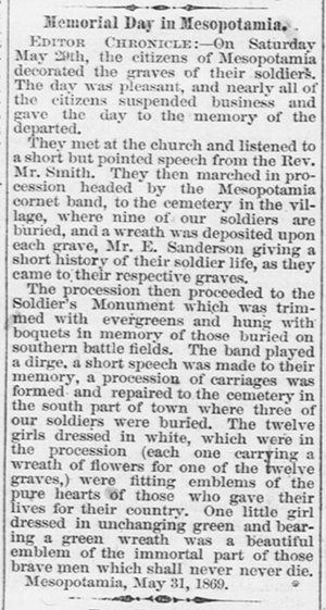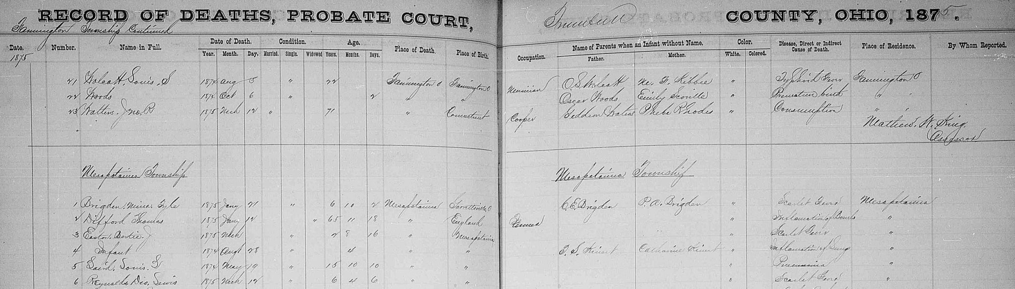 On December 28, 1874, the newspapers in nearby Hiram, Ohio reported an unusually malignant epidemic of scarlet fever sweeping through their town in the months prior, taking children of all ages, even multiples from a single household. A scarlet fever epidemic killed at least twelve young children in Jackson County in southern Ohio and several children in Ashtabula County just north of Mespo in the same month that Dio died. Cincinnati lost hordes of children to the disease throughout the year of 1875. These being just a few examples of how the epidemic devastated communities and destroyed families.