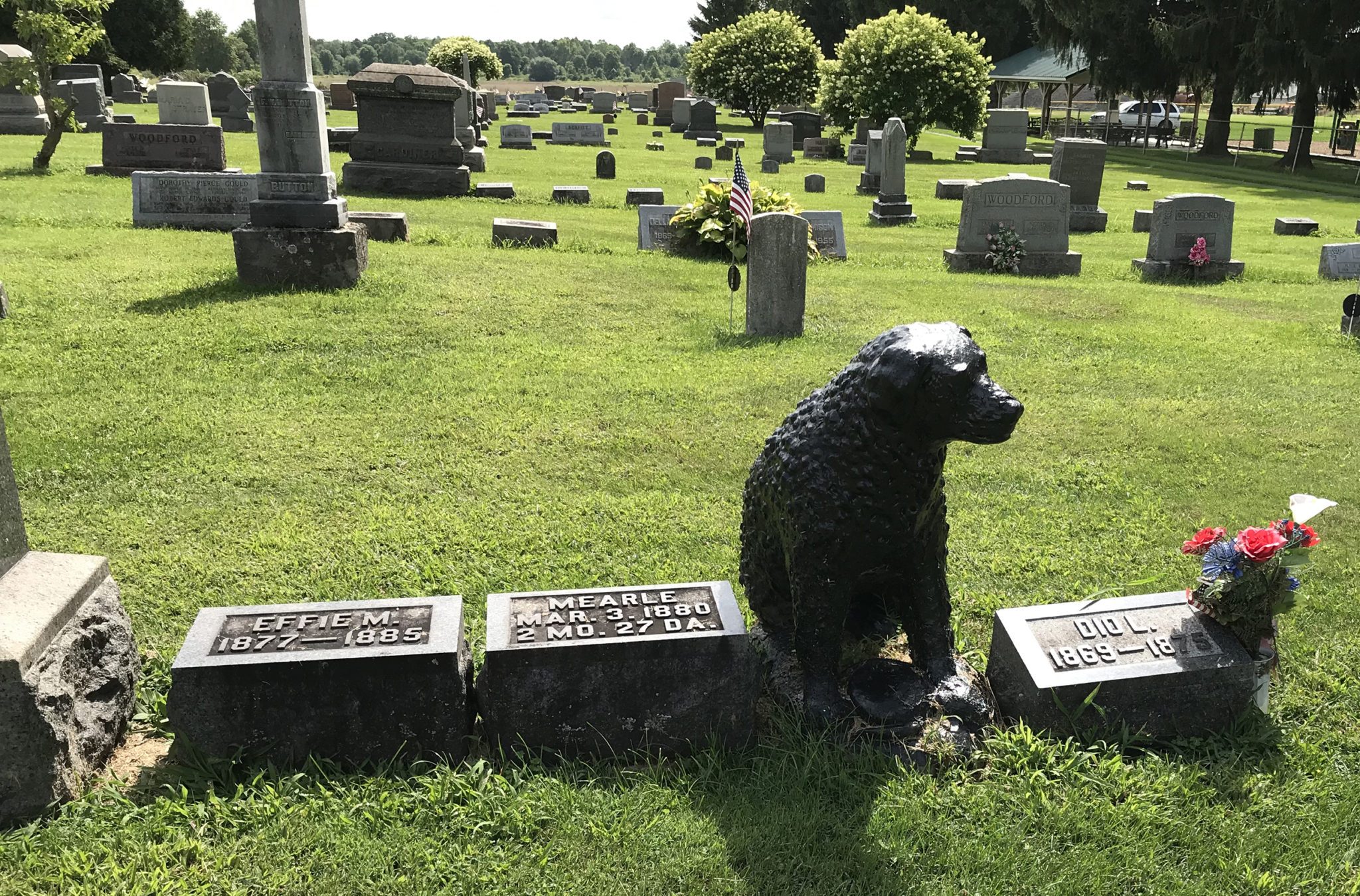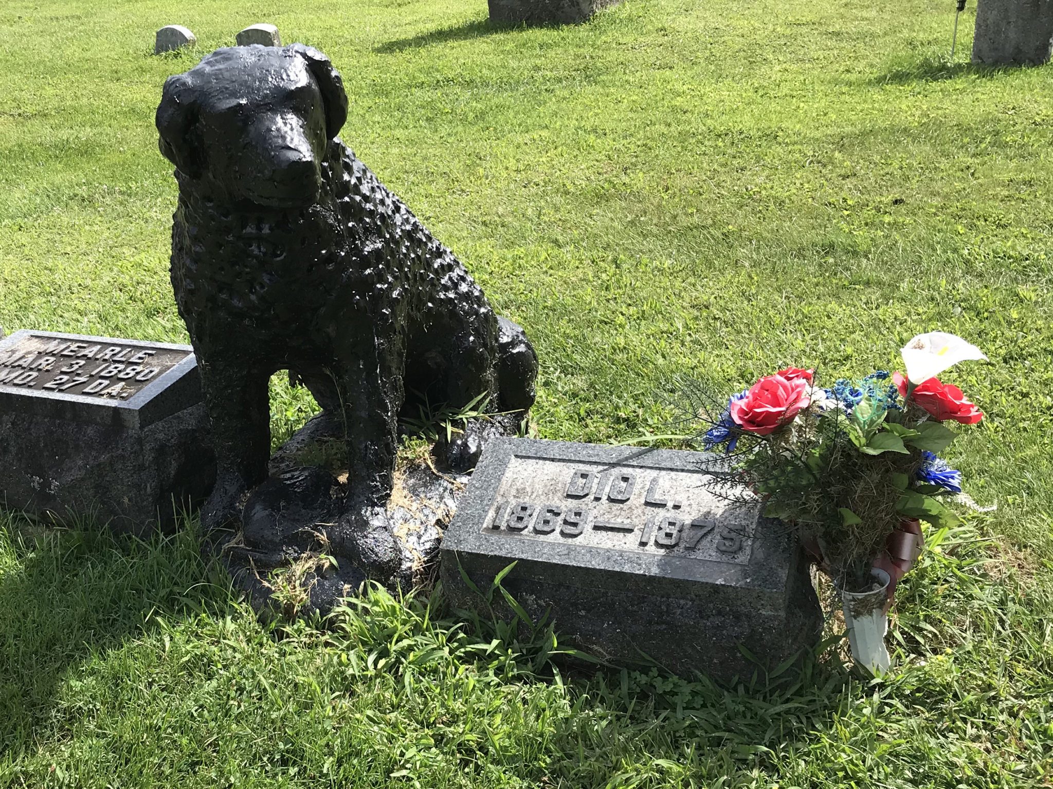 One of the most popular of Brigden’s sculptures in Fairview Cemetery is “The Dog Who Waits for His Master”, a black stone dog sitting vigil by the grave of its owner, Dio Lewis Reynolds, a six-year-old boy. It is said that when Dio died on March 12, 1875 and was buried in the cemetery, his dog often came to lay on the grave. Brigden later carved the sculpture in the loyal dog’s memory. Legend says that Dio died falling out of an apple tree and many publications have perpetuated this myth. For example, a Star Beacon article from 2012, reads: