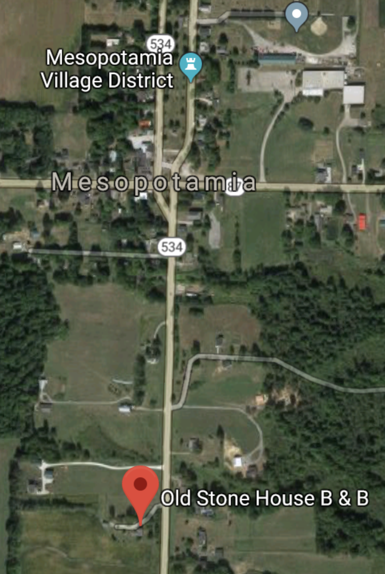 When Robin and I hear about a historic walking tour of Mesopotamia, or “Mespo” as the locals call it, we leap at the opportunity for a little adventure in the vicinity of our hometown. We meet with a group of other historians at the Old Stone House for the event that was organized by the Trumbull County Historical Society. The tour is hosted by Darcy Miller, owner and operator of the Old Stone House Bed and Breakfast just south of Mesopotamia Commons on Rt 534. She serves coffee and cinnamon buns and is as warm and friendly as the atmosphere of the bed and breakfast.