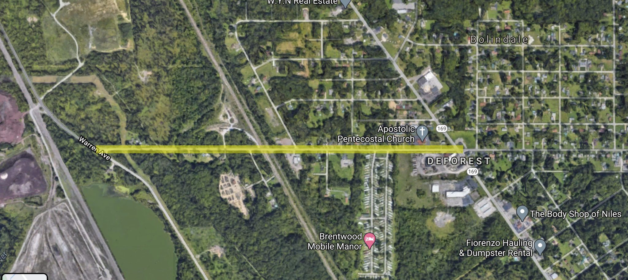 Deforest was a former railroad junction near Niles that ran along the paved brick highway between Niles and Warren. Today, the site of the former junction rests near the old steel mills in Warren at Deforest Road between Warren Avenue and State Route 169. The railway track rolled over Bolin Hill, a slope 1,000 feet above sea level that was deemed picturesque for the homes built along its curves, but proved altogether fatal when combined with the track. Due to the steep crest, pedestrians and drivers could not see a streetcar until it was nearly on top of them. It was custom for the motorman to ring the bell along this stretch of road, but that precaution did not always prevent accidents. The Mahoning Valley Railway Company eventually came under fire for streetcars flying down Bolin Hill at a high rate of speed but would not admit to any amount of negligence on their part.