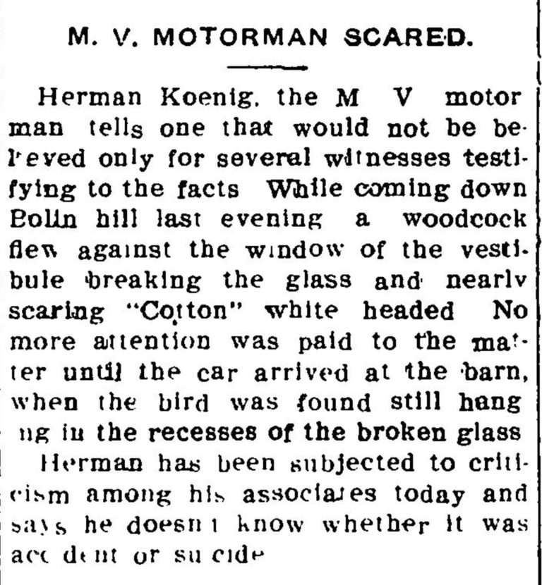 H. Enycart had been the motorman of the street car and said he had followed the normal safety protocol by sounding the whistle regularly from the top of Bolin’s Hill to the time of the accident. He noticed the milk wagon but claimed Carnsew showed no sign of turning until the streetcar was two car lengths away. As soon as he saw Carnsew turn, he attempted to brake the streetcar but the gravity of the downward slope rapidly propelled the vehicle towards the wagon. At 9:25 in the evening, it would have been quite dark besides the streetlights and lights of the streetcar. Paired with the steepness of the hill, visibility would have been much reduced.
