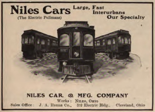 Advertisement for Interurban streetcars that were once constructed at a factory in Niles, Ohio