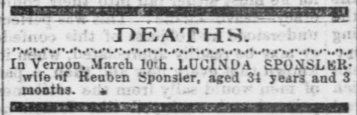 In 1860, the Sponsler family resided in Vernon after living in Pennsylvania for a short time. Reuben worked as a farmer with his real estate valued at $4,300 and his personal estate valued at $1,000. He kept a live-in servant, Sarah Brown, aged nineteen. They lived on a farm on the north side of Rt 88 at the border of Vernon and Greenville, PA, next to the present-day State Line Bar and Gril. A crop field sits where the Sponslers once lived.