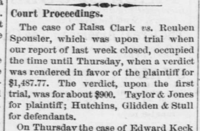 His legal troubles were not over. Ralsa Clark, a prominent landowner in Vernon, took Reuben to court in 1868. Mark Goldrich, too, acted as plaintiff in a separate case against Reuben. Again, in 1870, Reuben had a court date with Ralsa Clark for an unspecified issue and lost, leaving Reuben to pay a hefty fine.